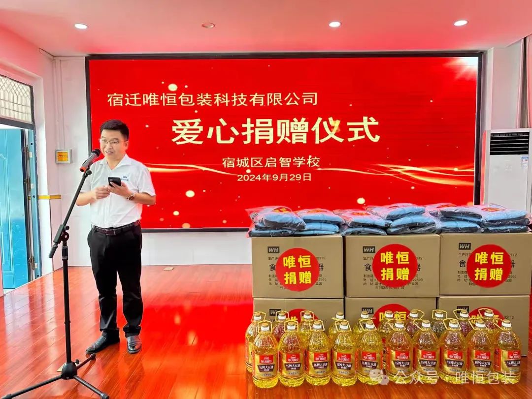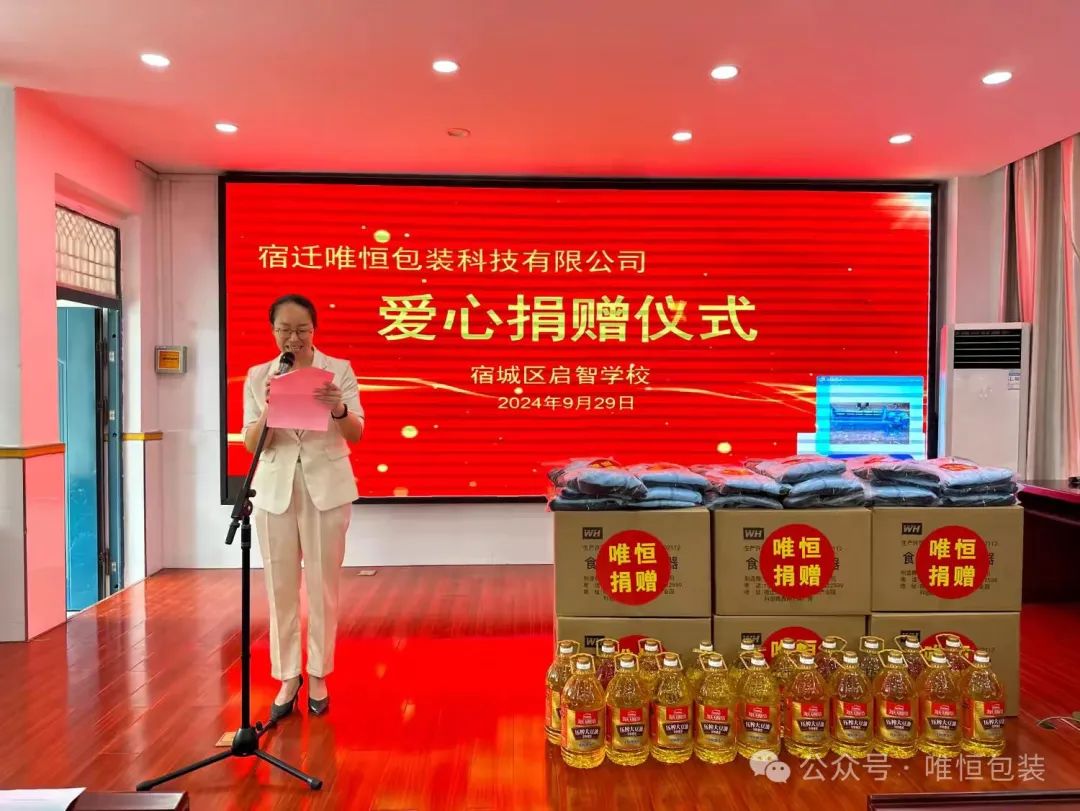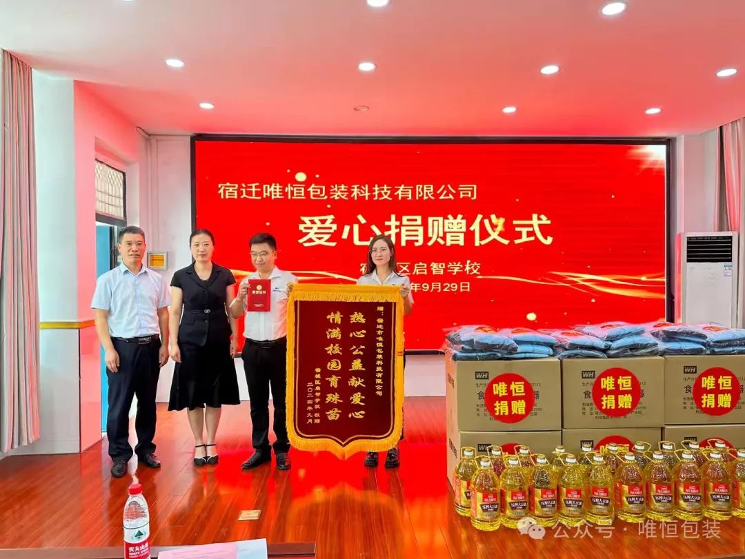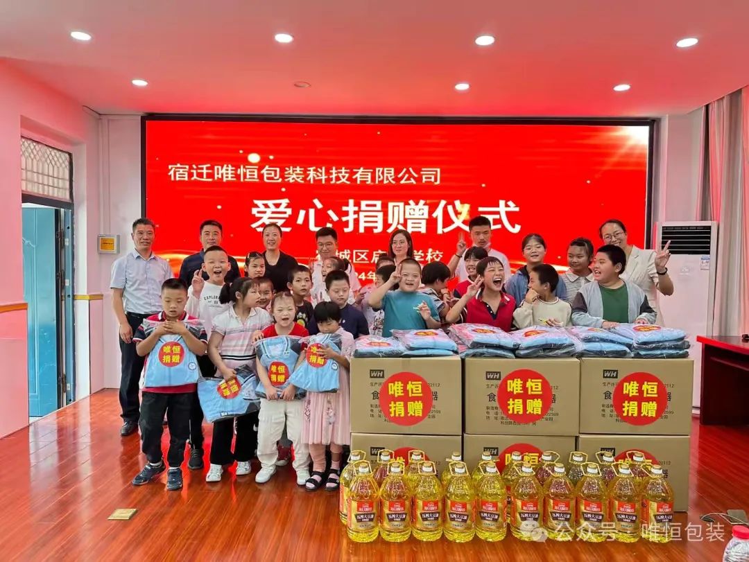 宿迁市唯恒包装科技有限公司从7年前落户宿城那一天起,即承担起扶贫济困和发展慈善事业的责任!唯恒人始终认为企业应在获取社会资源、赚取企业利润的同时,注重其自身对社会的回报与贡献-自觉履行企业社会责任!